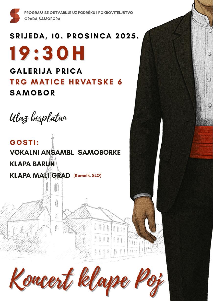 U srijedu, 10. prosinca u 19:30 sati, u galeriji Prica u Samoboru klapa Poj održava svoj tradicionalni Godišnji koncert. Uz domaćine nastupaju Vokalni ansambl Samoborke, klapa Barun iz Svete Nedelje te gosti iz Slovenije – klapa Mali Grad iz Kamnika. Ulaz je slobodan, a koncert se ostvaruje uz podršku Grada Samobora. Dođite i uživajte u klapskoj večeri, klapa Poj vas srdačno očekuje.